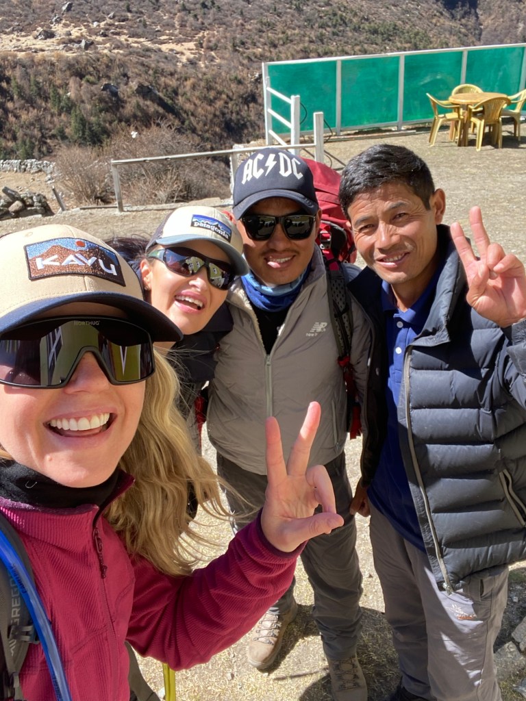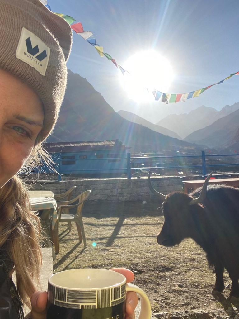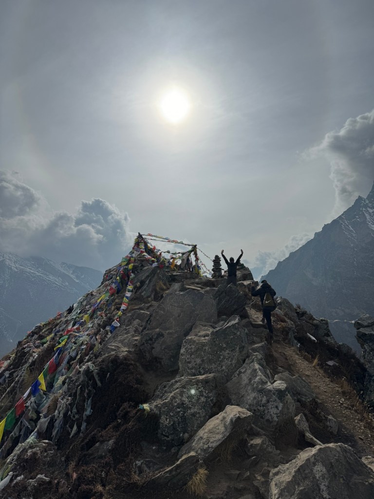 Da vi endelig kom til vårt øverste punkt og mål, var det en sist utfordring som gjenstod. Bestige fjellet Kyanjin Ri på 4.300 m.o.h. Cathrine var totalt ferdig i både pust og fysikk etter en svært krevende etappe for henne, men Anne gav en skikkelig pep-talk og klarte merkelig nok å motivere henne. Det å stå sammen oppe på fjellet var en seier for oss begge! – at vi klarte dette sammen! Utsikten var helt ubeskrivelig! Vi var omringet av store, høye og majestetiske fjell, så langt øye kunne se.