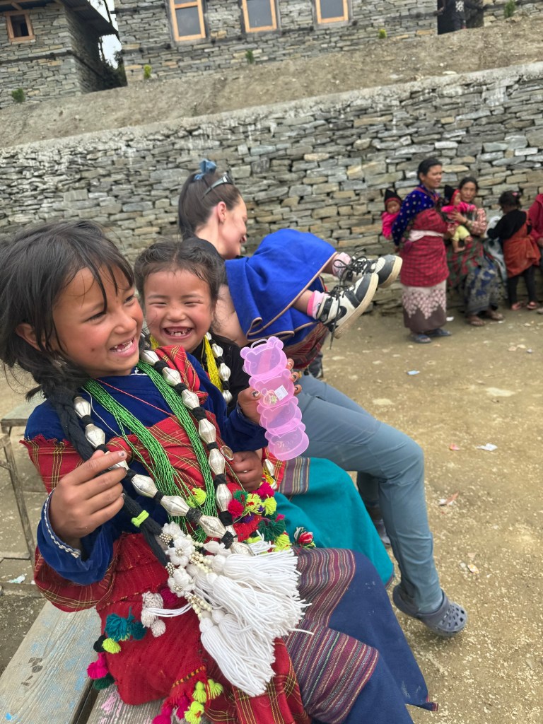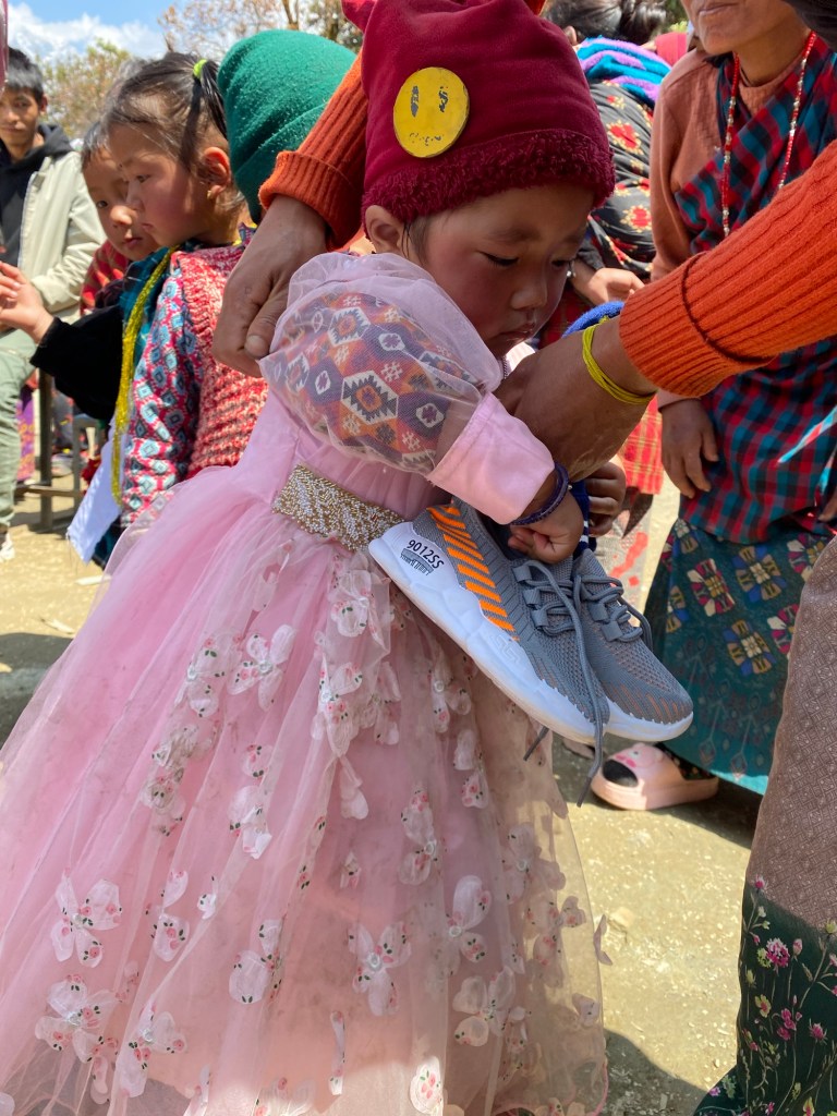 Den siste dagsetappen før vi skulle komme til Sertung gikk vi gjennom en liten fjellandsby. Yek fortalte oss at her var alle veldig, veldig fattige, så her ville det være fint om vi kunne gi ut noe fra ekstrabagen vi hadde med oss. Da vi stoppet og tok frem bagen, strømmet det mennesker til, store som små. Vi gav ut sko, noen varme klær og mange tannbørster og tannkrem. De pusset tennene, lo og sang så skummet sprutet! Det var helt herlig å se den gleden vi kunne gi dem. Med våte øyne og en glede av å kunne gi, startet vi på de siste timene før vi skulle komme til Sertung.